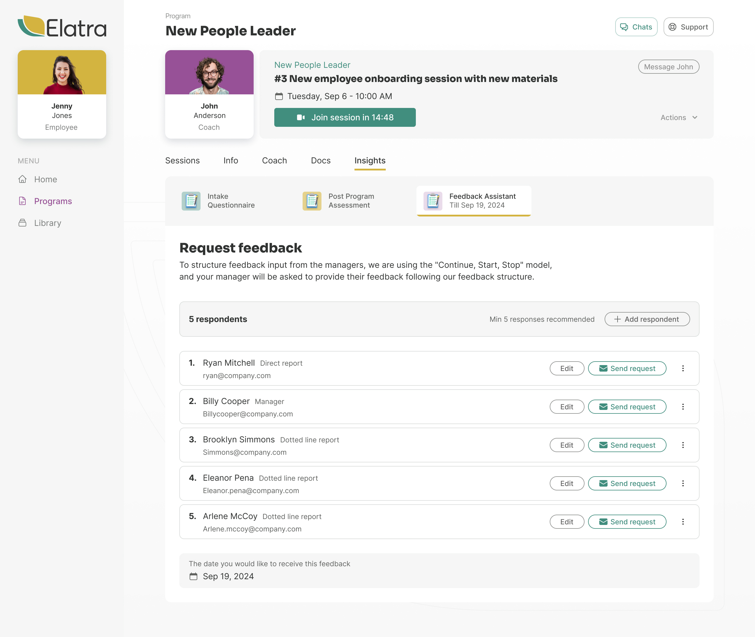Feedback Assistant is integrated into Elatra’s coaching platform and is available to all users. When starting a coaching journey, a coachee selects individuals from whom they wish to receive feedback and sends them email invitations via the platform.