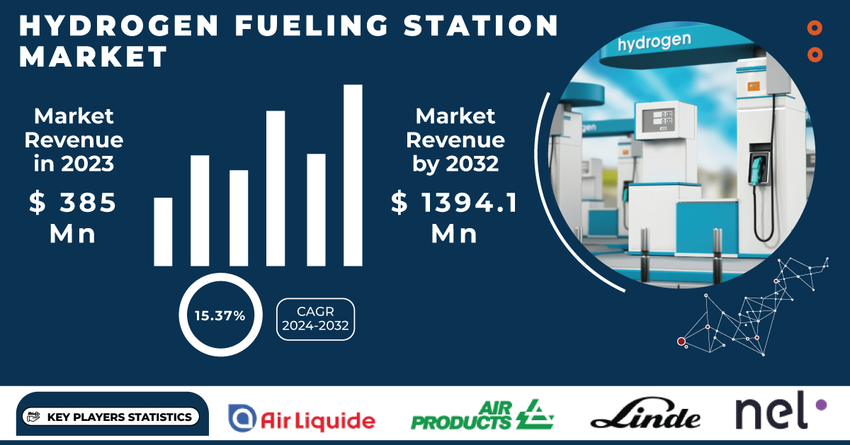 AUSTIN, TX, UNITED STATES, December 3, 2024 /EINPresswire.com/ -- The Hydrogen Fueling Station Market size was valued at USD 385 million in 2023 and is expected to grow to USD 1394.1 million by 2032 and grow at a CAGR of 15.37% over the forecast period of 2024-2032.Hydrogen Fueling Station Market Expands with Technological Advancements, Rising Investments, and Global Push for Decarbonization