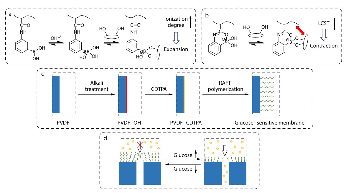 For years, glucose-sensitive membranes have been a key focus for improving controlled insulin release in diabetes treatments. Glucose-sensitive membrane was previously constructed using glucose oxidase (GOD)-based glucose-sensitive materials. GOD-based systems suffer from limited oxygen supply and inactivation by hydrogen peroxide. Phenylboronic acid (PBA), well-known glucose reporter, exhibits higher reliability compared with GOD. Unfortunately, most PBA-based glucose-sensitive materials are expansion-type and cannot be used as chemical valves in glucose-sensitive membrane for insulin delivery.
