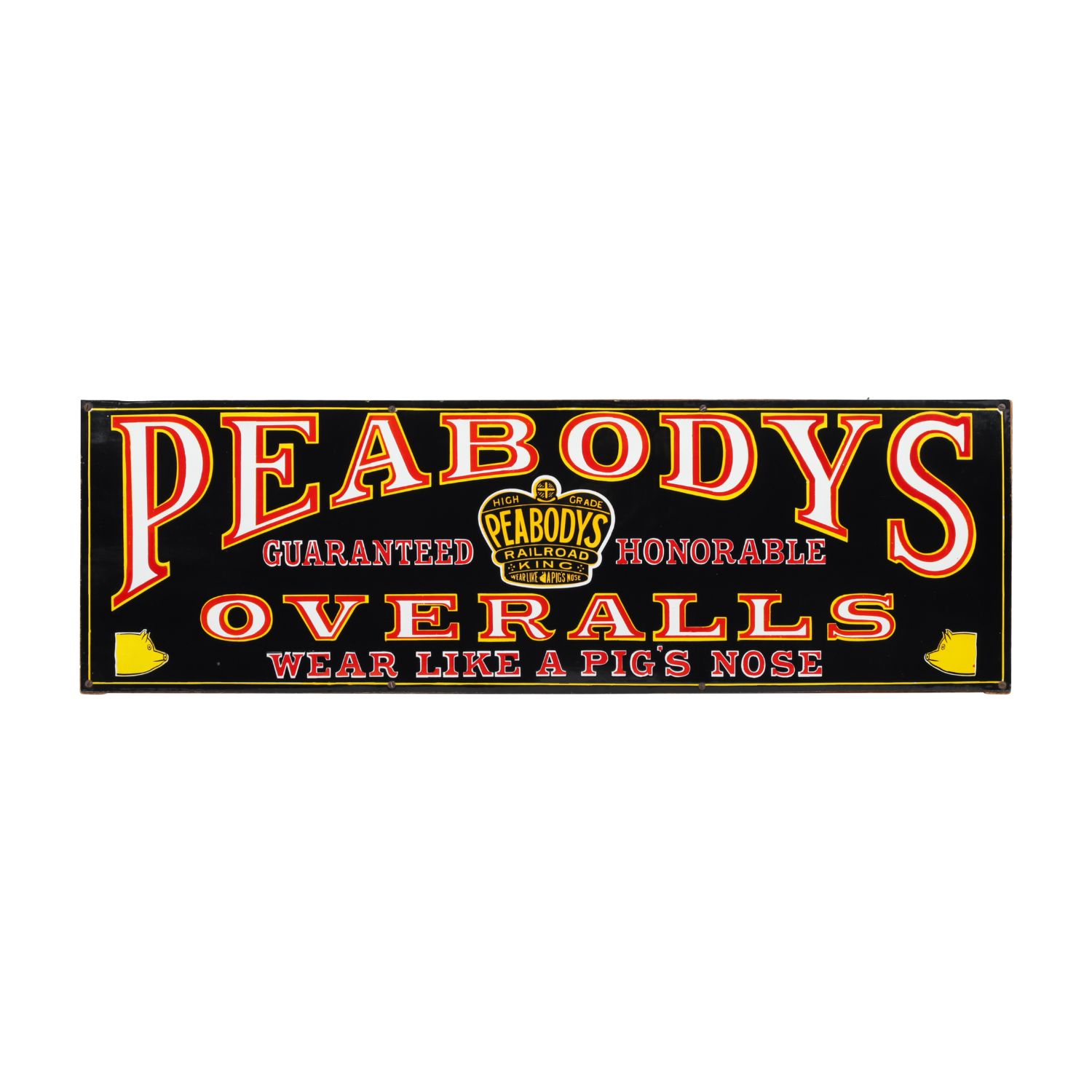 Canadian Peabody’s (“Railroad King”) Overalls single-sided porcelain sign from the 1910s, 15 inches by 48 inches. They made uniforms for the British Army in World War I (CA$18,880).