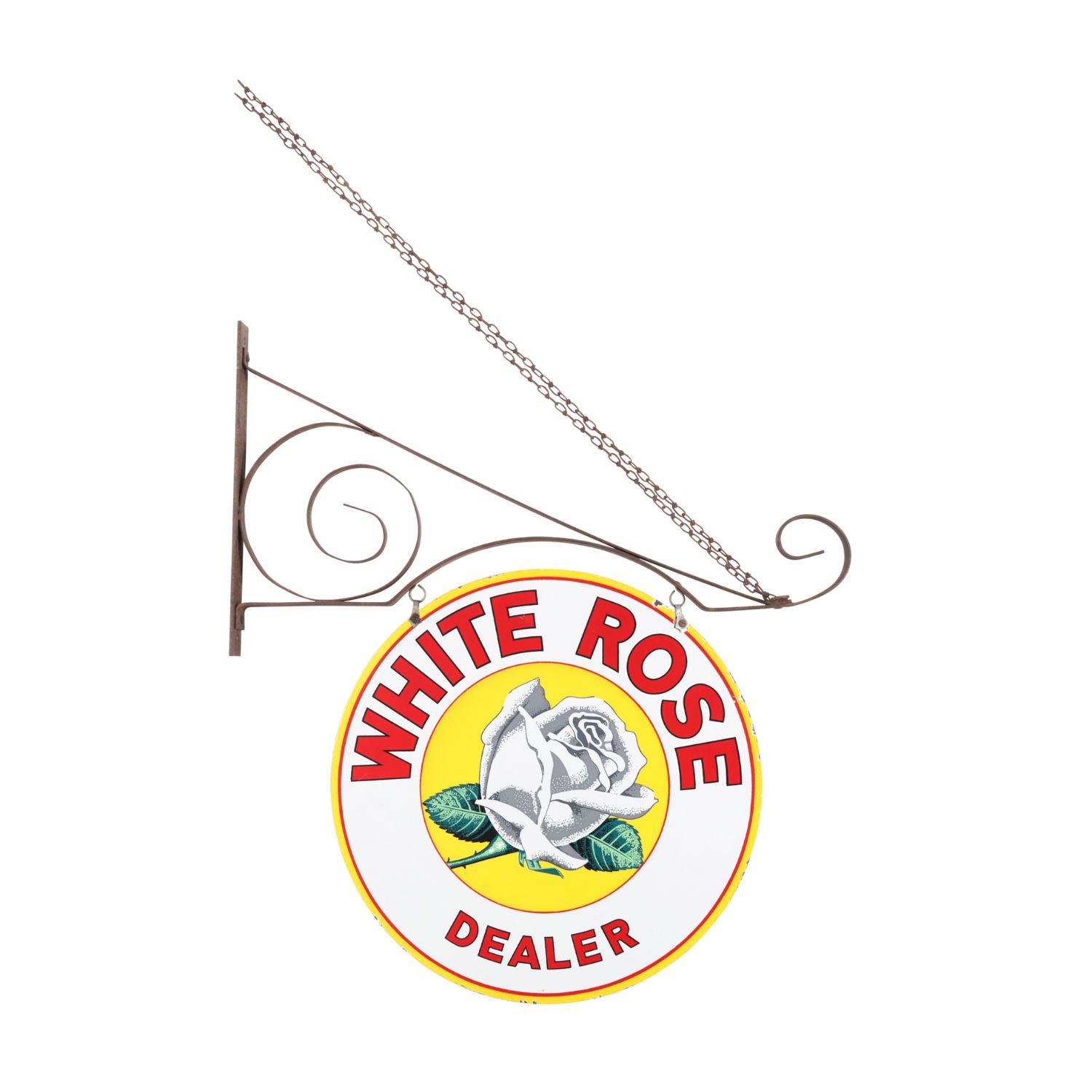 Canadian 1940s White Rose Dealer sign, the 24-inch diameter double-sided version of one of Canada’s most recognizable petroliana signs, with bracket, 8.75 on both sides (CA$15,340).