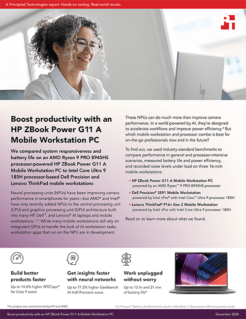 In the second comparison report, PT writes, “Strong CPU, GPU, and NPU performance can help speed workflows and improve system efficiency for on-the-go professionals. In our hands-on tests, we found that the AMD Ryzen 9 PRO 8845HS processor-powered HP ZBook Power G11 A Mobile Workstation PC received comparable or higher general productivity, content creation, and AI benchmark scores than the Intel vPro with Intel Core Ultra 9 processor 185H-powered Dell Precision 3591 and Lenovo ThinkPad P16v Gen 2 mobile workstations. As an added bonus, the AMD Ryzen 9 PRO 8945HS processor-powered HP ZBook Power G11 A Mobile Workstation PC also delivered all-business-day battery life.”