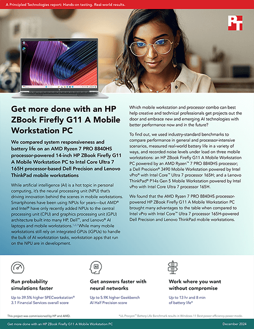The report for the first comparison states, “In our hands-on tests, we found that the AMD Ryzen 7 PRO 8840HS processor-powered HP ZBook Firefly G11 A Mobile Workstation PC received higher general productivity, content creation, and AI benchmark scores than the Intel vPro with Intel Core Ultra 7 processor 165H-powered Dell Precision 3490 and Lenovo ThinkPad P14s Gen 5 mobile workstations. As an added bonus, the AMD Ryzen 7 PRO 8840HS processor-powered HP ZBook Firefly G11 A Mobile Workstation PC also delivered significantly longer battery life.”