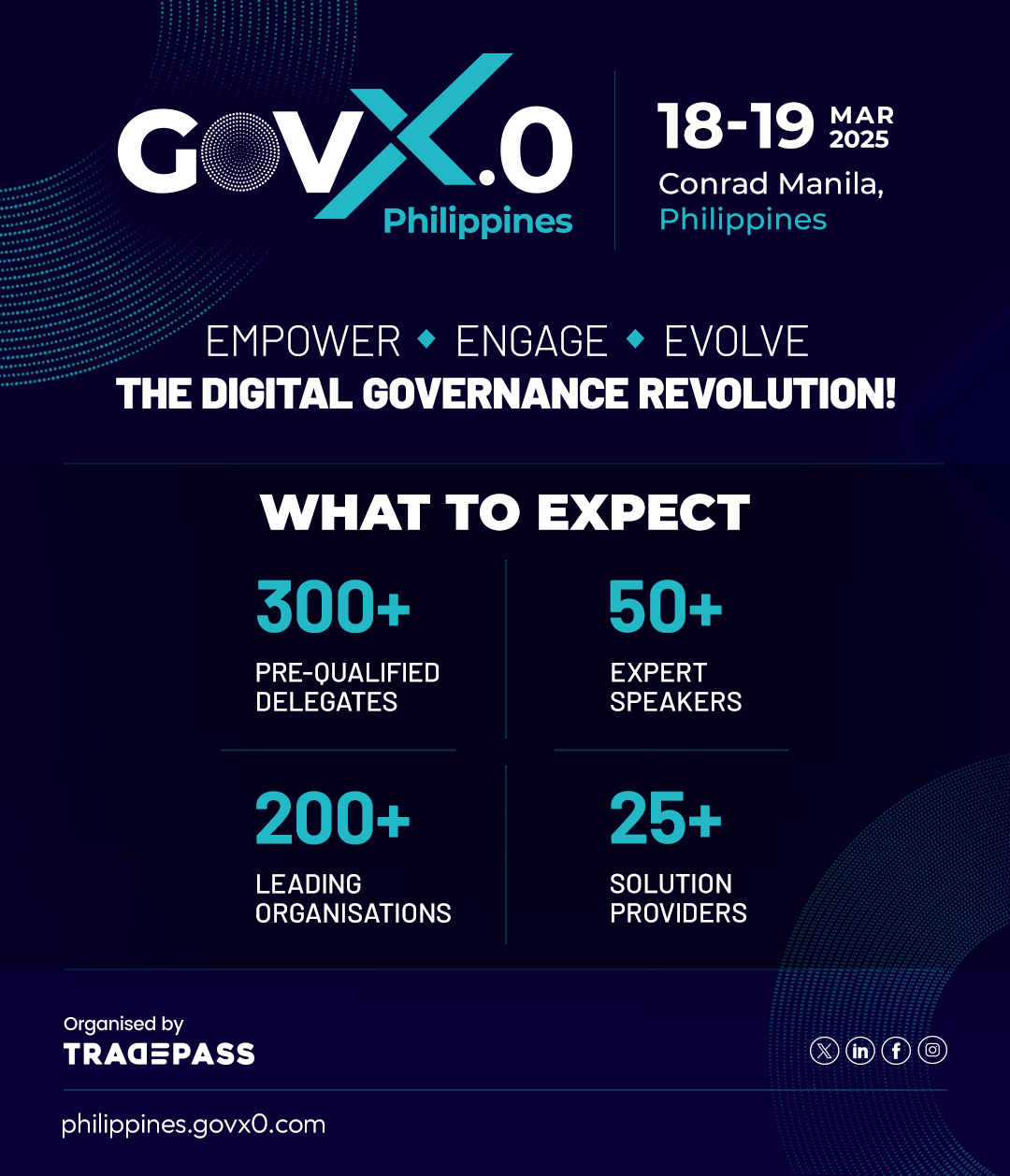 BENGALURU, INDIA, January 23, 2025 /EINPresswire.com/ -- Post-establishing successful mega-scale platforms for numerous tech domains, Tradepass has taken the bold initiative to host the biggest event focused on digital governance in the Philippines.Scheduled for 18 – 19 March 2025 at Conrad Manila, GOVX.0 is set to empower the Filipino government's digital journey by bringing together policymakers, key government officials, and leading tech giants under one roof.