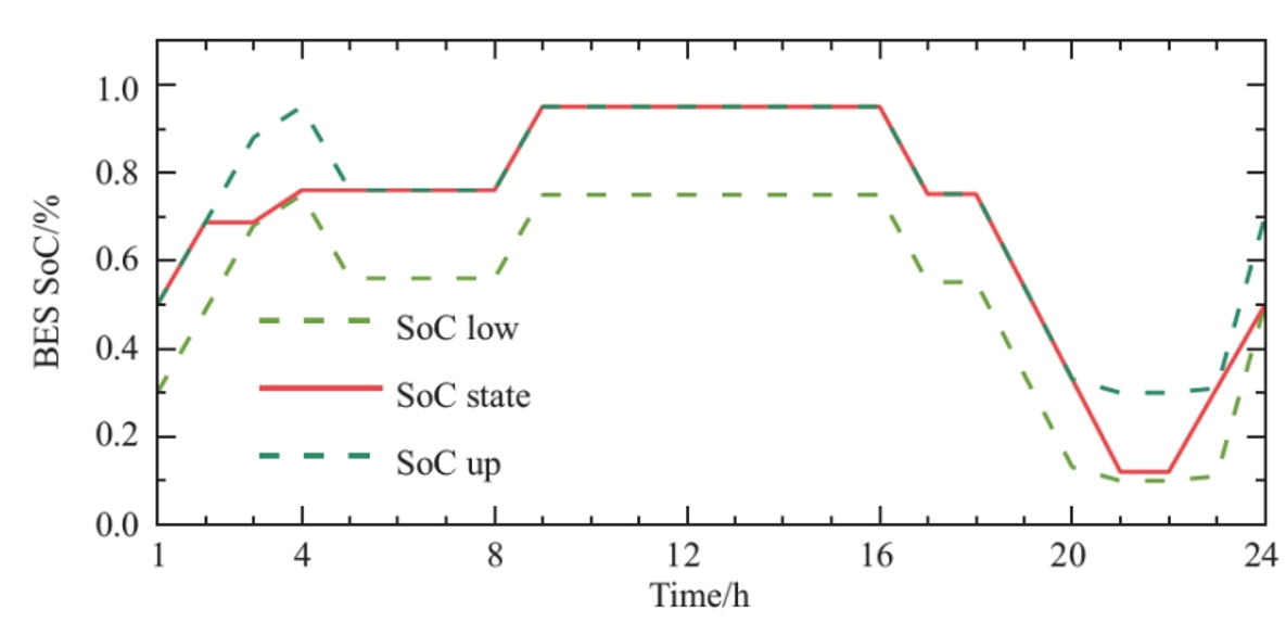 In the model, detailed in the journal Global Energy Interconnection, the day-ahead stage utilizes robust optimization to establish the hydrogen dispatch and battery storage state-of-charge (SoC) upper and lower bounds, while the intraday stage focuses on dispatching battery storage within the defined SoC interval, taking into account the uncertainty realization from a holistic daily perspective.