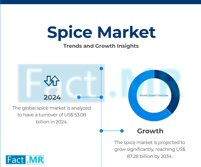ROCKVILLE PIKE, MD, UNITED STATES, December 18, 2024 /EINPresswire.com/ -- According to a new study published by Fact.MR, a market research and competitive intelligence provider, the worldwide spice market is approximated to generate a revenue of US$ 53.08 billion in 2024 and is projected to touch a value of US$ 87.28 billion by the end of 2034.Customers' desire for a broad variety of genuine and authentic flavors is driven by the growing popularity of home cooking, which is mostly attributable to social media, cookery shows, food blogs, and other sources. This trend is increasing people's curiosity about trying out new recipes and discovering new cuisines. This is one of the main causes behind the spice market growth.