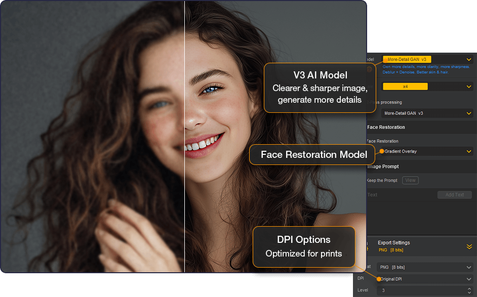 The new AI Face Restoration feature employs advanced algorithms to recover natural facial details, remove imperfections such as blemishes, acne, red eyes, freckles, blurriness, and grain, enhancing group photos, selfies, old portraits, low-light pictures, and AI-generated images. Combining Gradient Overlay for seamless transitions and Routine Overlay for efficient processing, it produces lifelike and high-quality results.