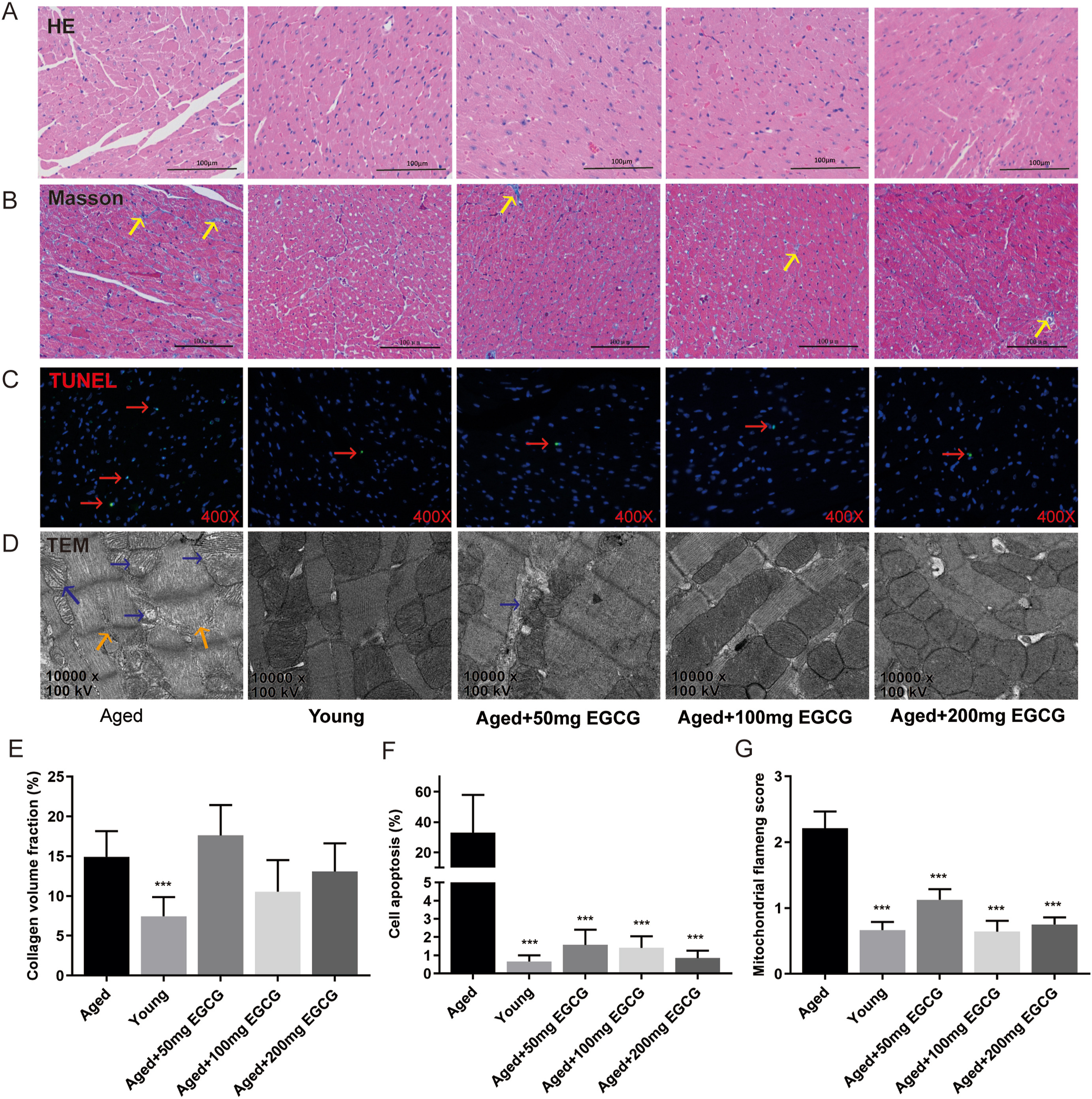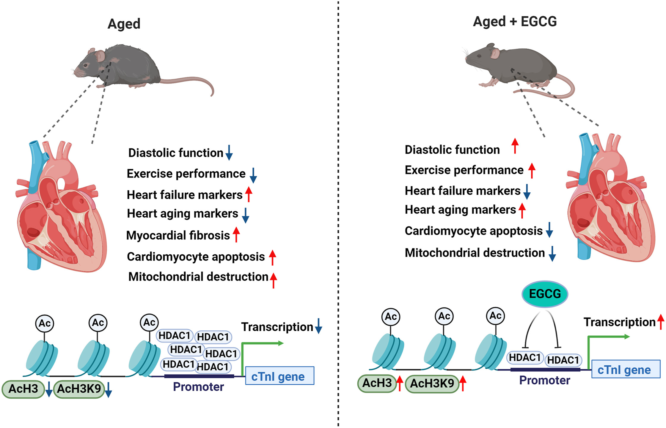 In this study, 12-month-old female mice were orally administered 50, 100 and 200 mg EGCG mixed with drinking water for 6 months. Aged mice (18 months old) exhibited the major features of HFpEF, including CDD with pEF, cardiac fibrosis, increased cardiomyocyte apoptosis, and mitochondrial damages, as well as elevated A/B-type natriuretic peptide. Cardiac troponin I (cTnI) expression was also reduced. Long-term administration of 100 or 200 mg EGCG prevented aging-related CDD and exercise capacity decline, along with alleviating myocardial apoptosis and mitochondria damage. The transcription and protein expression of cTnI were increased, which might be achieved by inhibiting the expression and activity of histone deacetylase 1 (HDAC1), and reducing its binding level near cTnI's promoter, thereby elevating acetylated histone 3 (AcH3) and acetylated lysine 9 on histone H3 (AcH3K9) in the aged mice.