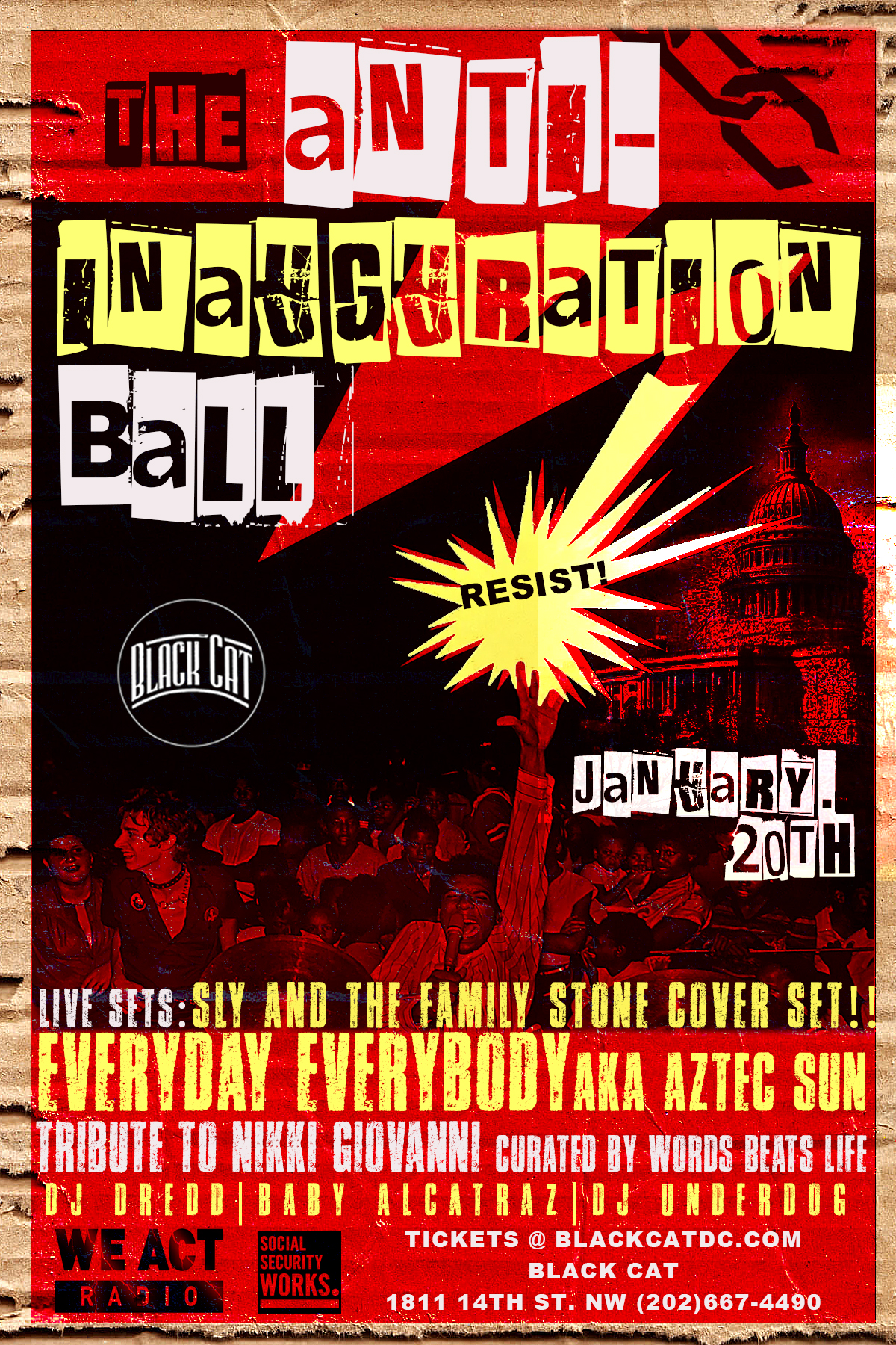 On the evening of January 20, 2025, the Historic Black Cat, the Anti-Inauguration Ball hosted by We Act Radio, Social Security Works, and the Black Cat, the DC community will gather to stand on what cultural democracy truly means, as art brings change. This date, coinciding with the presidential inauguration, symbolizes a stand for local autonomy and the power of community resilience.
