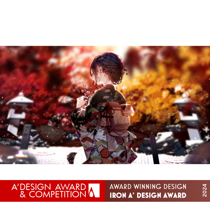 Jui-Ping Lee's New Year is a captivating digital artwork that transports viewers to a serene courtyard on a cold winter's day. The elegant figure, adorned in a magnificent kimono, sits amidst a gentle flurry of snow and vibrant autumn leaves, embodying the essence of Wabisabi (the beauty of solitude and tranquility). The intricate patterns on the kimono, featuring pines and sea waves, symbolize solemnity and serenity, while the delicate details, such as the artist's pen-name on a stone plate and the mice patterns representing the year 2020, add depth and meaning to the composition.