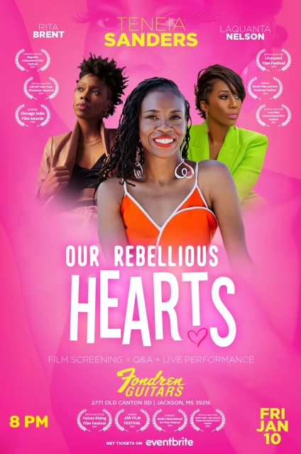 JACKSON, MS, UNITED STATES, December 31, 2024 /EINPresswire.com/ -- A special screening of "Our Rebellious Hearts" with Director Talamieka Brice, Producer Teneia Sanders, and Co-Stars Dr. LaQuanta Nelson and Rita Brent will take place in Jackson, MS on January 10th.This event promises a night of culture, creativity, and conversation with a screening of the award-winning film "Our Rebellious Hearts" at Fondren Guitars by Patrick in Jackson, Mississippi. This one-of-a-kind event features a live performance and an engaging Q&A session following the screening, along with delicious offerings from Josephine’s Kitchen food truck.