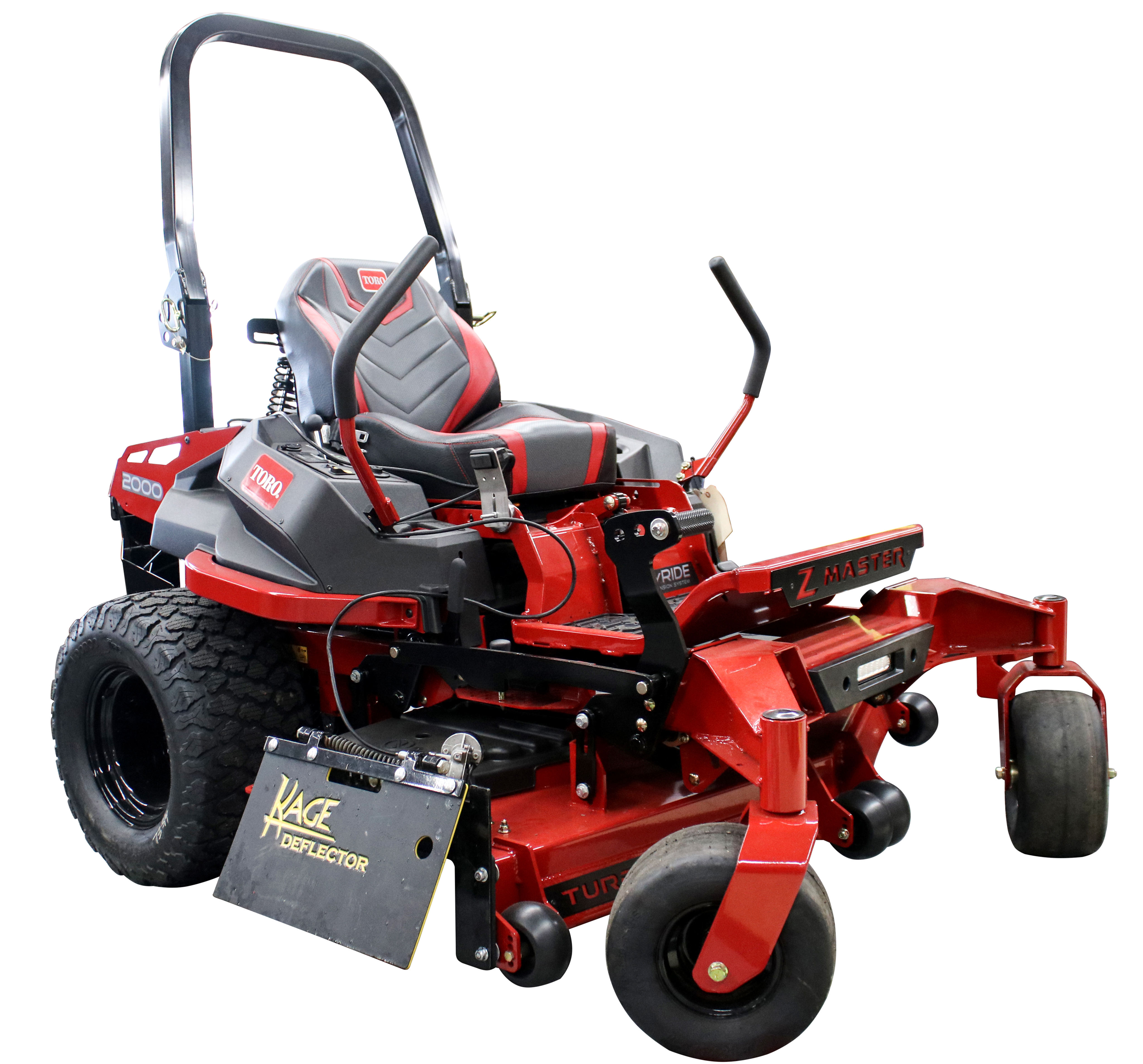 What makes the new KAGE Grass Deflector unique is that it’s designed to fit numerous makes and models of commercial lawnmowers and is controlled by an electronic toggle switch rather than hand levers or foot pedals. The flap can also be clamped closed using a torsion spring.