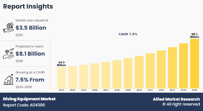 Diving equipment market size was valued at $3.5 billion in 2023, and is projected to reach $8.1 billion by 2035, growing at a CAGR of 7.5% from 2024 to 2035.