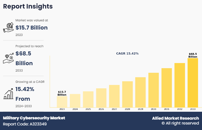 Military cybersecurity market Size was valued at $15.7 billion in 2023, is projected to reach $68.5 billion by 2033, grow at a CAGR of 15.4% from 2024 to 2033.