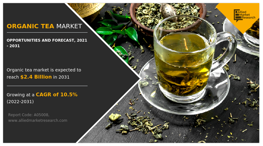 Organic Tea Market Size was at $905.40 million in 2021, and is estimated to reach $2.4 billion by 2031, growing at a CAGR of 10.5%