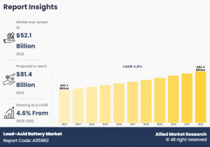 According to a new report published by Allied Market Research, the lead-acid battery market size was valued at $52.1 billion in 2022, and is estimated to reach $81.4 billion by 2032, growing at a CAGR of 4.6% from 2023 to 2032.