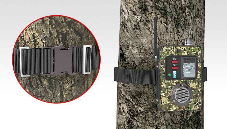 Speakers integrated into the module play audio when instructed from the smartphone. Hunters can choose when to release the attractant to mask human scent. The combination of scent and sound features helps attract large and small game to a hunting area via its remote features. The system can be used with multiple units of the speaker, acting like a deer or other prey, set up in different areas. Units can be used at different times to make it look like the animal is moving. It could also be attached to a decoy.