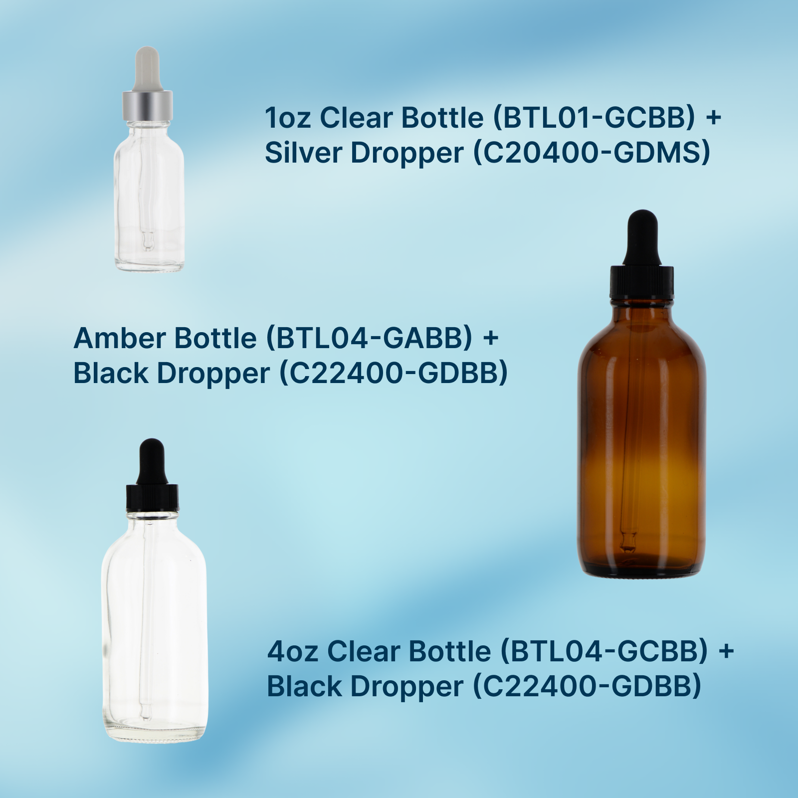 • 1oz Clear Bottle (BTL01-GCBB): https://apackaginggroup.com/products/glass-boston-round-bottle-in-stock