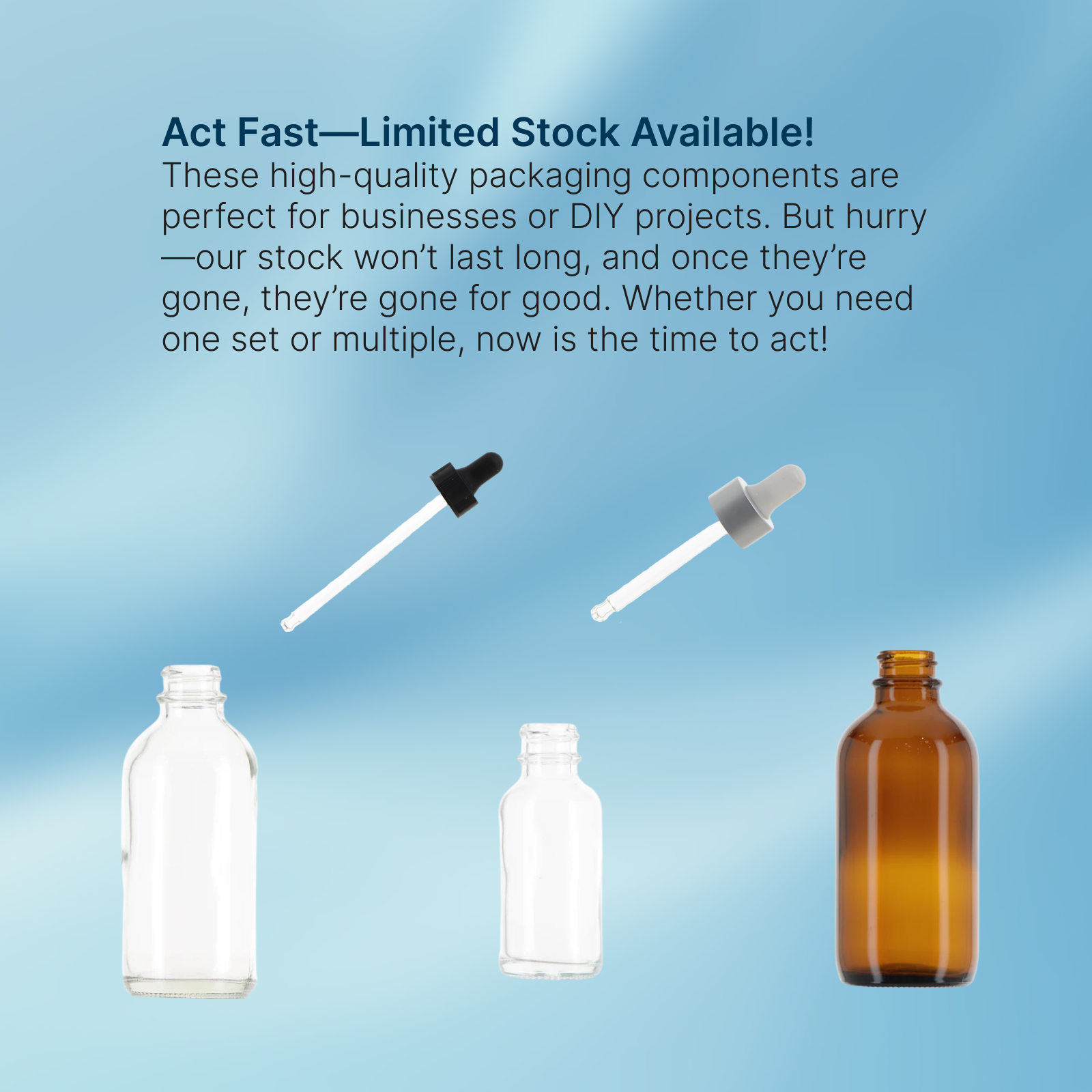 1oz Clear Bottle with Silver Dropper: Perfect for serums or samples, offering a sleek and high-end aesthetic.