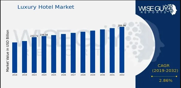 NEW YORK, NY, UNITED STATES, January 13, 2025 /EINPresswire.com/ -- 𝐋𝐮𝐱𝐮𝐫𝐲 𝐇𝐨𝐭𝐞𝐥 𝐈𝐧𝐝𝐮𝐬𝐭𝐫𝐲 𝐎𝐯𝐞𝐫𝐯𝐢𝐞𝐰In 2023, Luxury Hotel Market was projected to be worth USD 232.72 billion. By 2032, the luxury hotel market is projected to have grown from 239.38 billion USD in 2024 to 300.0 billion USD. During the projection period (2025-2032), the luxury hotel market's compound annual growth rate (CAGR) is anticipated to be approximately 2.86%.