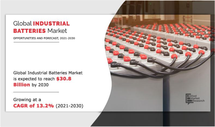 According to a new report published by Allied Market Research, The global industrial batteries market size was valued at $9.02 billion in 2020, and industrial batteries market forecast to reach $30.84 billion by 2030, growing at a CAGR of 13.2% from 2021 to 2030.