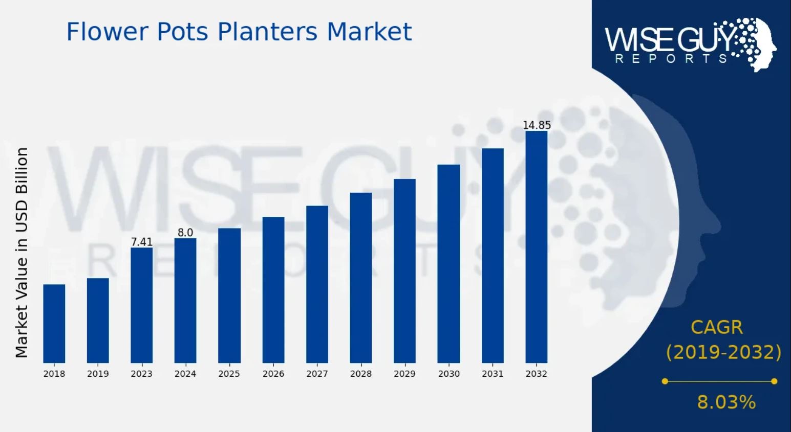 NEW YORK, NY, UNITED STATES, January 16, 2025 /EINPresswire.com/ -- Flower Pots Planters Market Size was estimated at 7.41 (USD Billion) in 2023. The Flower Pots Planters Market Industry is expected to grow from 8.0(USD Billion) in 2024 to 14.84 (USD Billion) by 2032. The Flower Pots Planters Market CAGR (growth rate) is expected to be around 8.03% during the forecast period (2024 - 2032).flower pots and planters market is poised for remarkable growth, according to the latest industry research report. With detailed insights into material types, sizes, shapes, drainage systems, usage patterns, and regional markets, the report projects significant trends shaping the industry over the next decade.