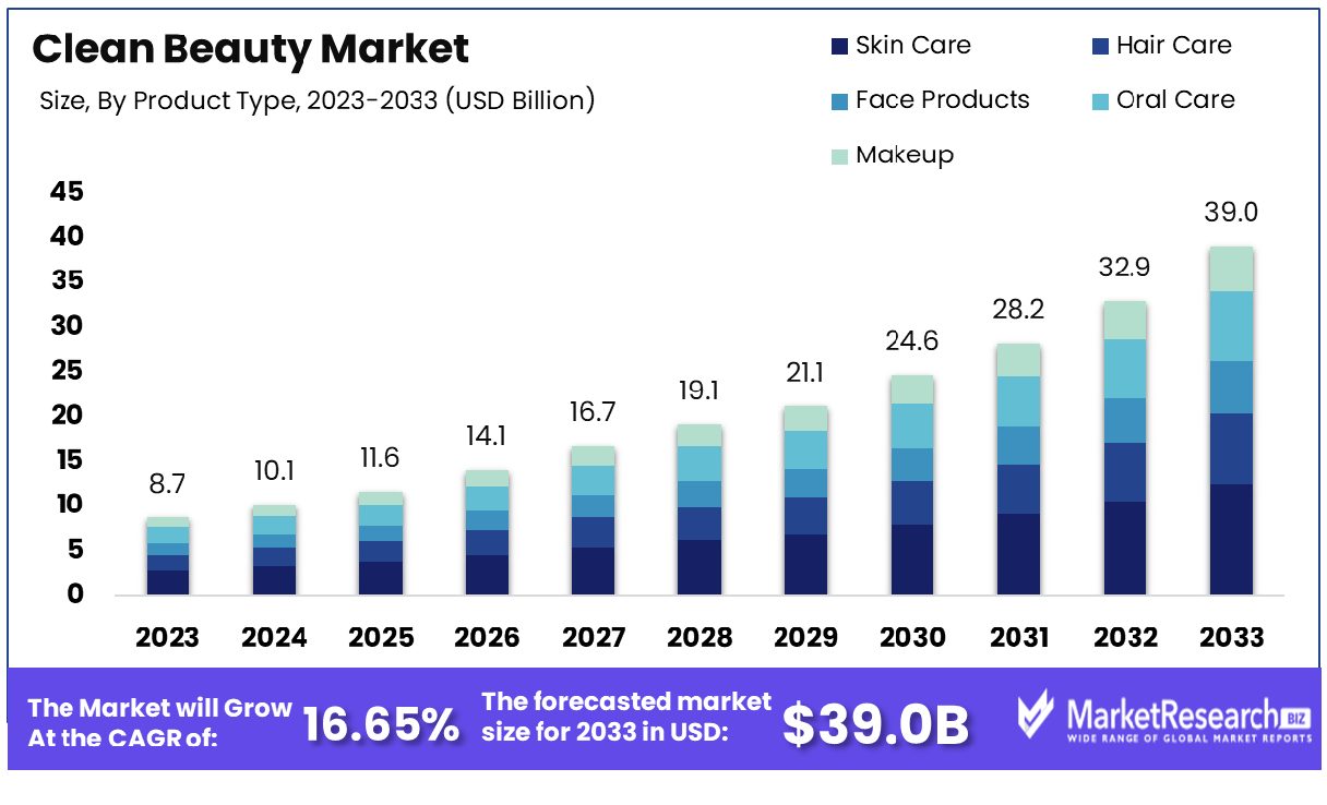 The clean beauty market, valued at USD 8.7B in 2023, is projected to reach USD 39B by 2033, growing at a CAGR of 16.65% from 2024 to 2033.