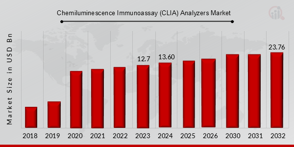 US, NY, UNITED STATES, January 22, 2025 /EINPresswire.com/ -- Market Research Future Latest Industry Insights on โChemiluminescence Immunoassay (CLIA) Analyzers Market Research and Growth Analysis By Type (High Throughput, Medium Throughput, and Low Throughput), By Product (Reagents, Analyzer, and Consumables), By Application (Oncology & Endocrinology, Hepatitis and Retroviruses, Cardiac Markers, Infectious Disease, Bone and Mineral Disorders, Auto-Immune Diseases, Allergy, GI Stool Testing, Drug Discovery and Development), By End User (Hospitals & Clinics, Medical & Diagnostic Laboratories, and Pharmaceutical Companies) And By Region (North America, EuโChemiluminescence Immunoassay (CLIA) Analyzers Market share valued at USD 12.7 billion in 2023. The Chemiluminescence Immunoassay (CLIA) Analyzers industry is projected to drive growth from USD 13.6 Billion in 2024 to USD 23.76 billion by 2032, exhibiting a CAGR of 7.1% during the forecast period 2024 - 2032.