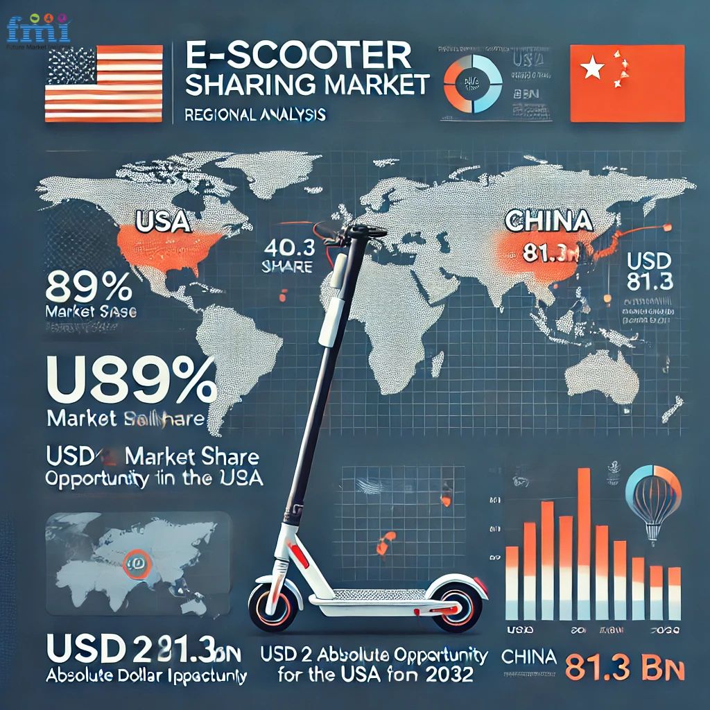 NEWARK, DE, UNITED STATES, January 23, 2025 /EINPresswire.com/ -- The global E-scooter sharing market was valued at USD 1.1 Billion in 2022 and is expected to reach USD 5.7 Billion by 2032 finds Future Market Insights (FMI) in a recent market survey. E-scooter sharing market is likely to surge at a vigorous 17.9% CAGR during the forecast period of 2022–2032. In free-floating sharing commuters can pick up and drop off the E-scooters from a place sanctioned by civic authorities. Hence, they can find free-floating sharing services convenient for short transit routes.Key Takeaways from Market Study