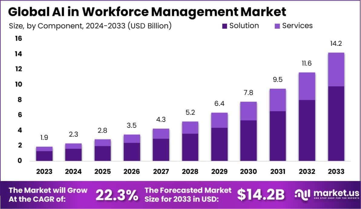The AI in Workforce Management Market is projected to reach USD 14.2 Billion by 2033, up from USD 1.9 Billion in 2023, growing at a CAGR of 22.3% from 2024 to 2033.