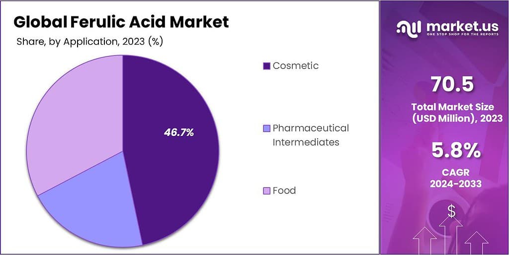 In 2023, Cosmetics dominated the ferulic acid market with 46.7% share, highlighting its widespread use in skincare and beauty products. Pharmaceutical Intermediates followed, utilizing ferulic acid in medication formulations, though to a lesser extent. Food applications also exist, mainly for antioxidant and flavor-enhancing purposes, but remain a smaller segment. Overall, ferulic acid's primary demand stems from the cosmetics industry, with notable yet lower contributions from pharmaceuticals and food.