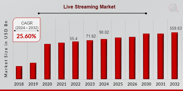 According to a new report published by Market Research Future (MRFR), Live Streaming Market is projected to grow from USD 90.01 Billion in 2024 to USD 559.63 Billion by 2032, exhibiting a compound annual growth rate (CAGR) of 25.60% during the forecast period 2024 - 2032.
