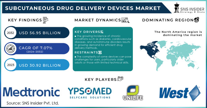 AUSTIN, TX, UNITED STATES, January 27, 2025 /EINPresswire.com/ -- According to Research by SNS Insider, The Subcutaneous Drug Delivery Devices Market, valued at USD 30.92 billion in 2023, is projected to reach USD 56.95 billion by 2032, registering a CAGR of 7.07% from 2024 to 2032.Market Overview