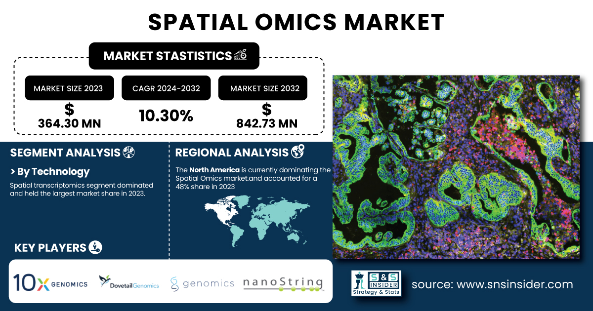 AUSTIN, TX, UNITED STATES, January 27, 2025 /EINPresswire.com/ -- According to Research by SNS Insider, The Spatial Omics Market size was valued at USD 364.30 million in 2023 and is Projected to rise at a CAGR of 10.30%, and is expected to reach USD 842.73 million by 2032. The global spatial omics market is growing at an unprecedented rate, owing to genomic technology developments and increasing focus on precision medicine.Market analysis