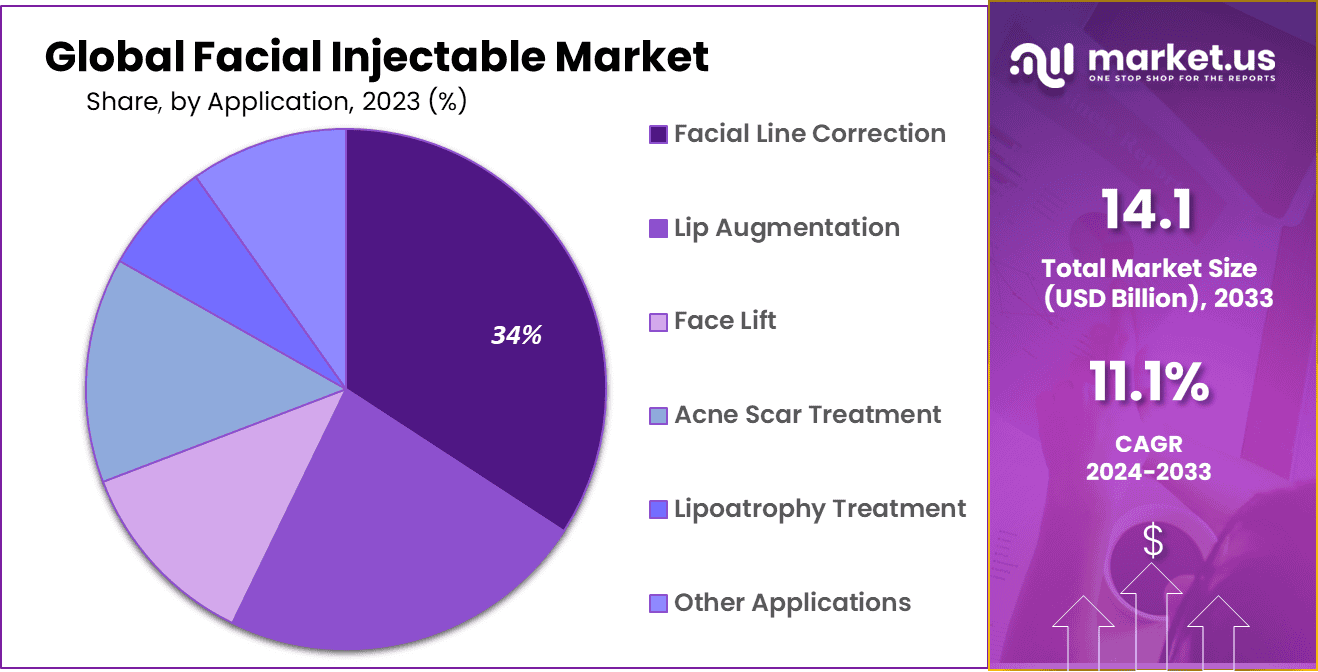 • Application Analysis: Facial line correction emerged as the largest application segment in 2023, accounting for 34.2% of the total revenue due to its popularity in addressing wrinkles and fine lines.