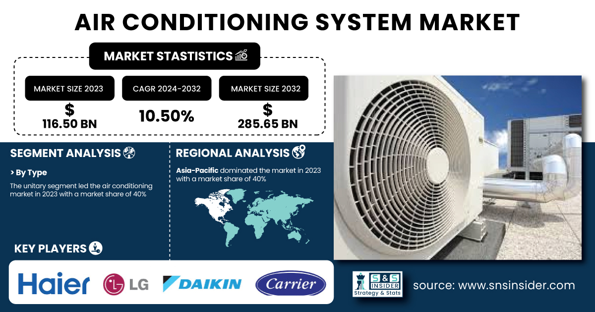 AUSTIN, TX, UNITED STATES, January 28, 2025 /EINPresswire.com/ -- The Air Conditioning System Market size was valued at USD 116.50 Billion in 2023. It is expected to grow to USD 285.65 Billion by 2032, growing at a CAGR of 10.50% over the forecast period of 2024-2032.Air Conditioning System Market Experiences Robust Growth Driven by Climate Change, Urbanization, and Smart Technologies.
