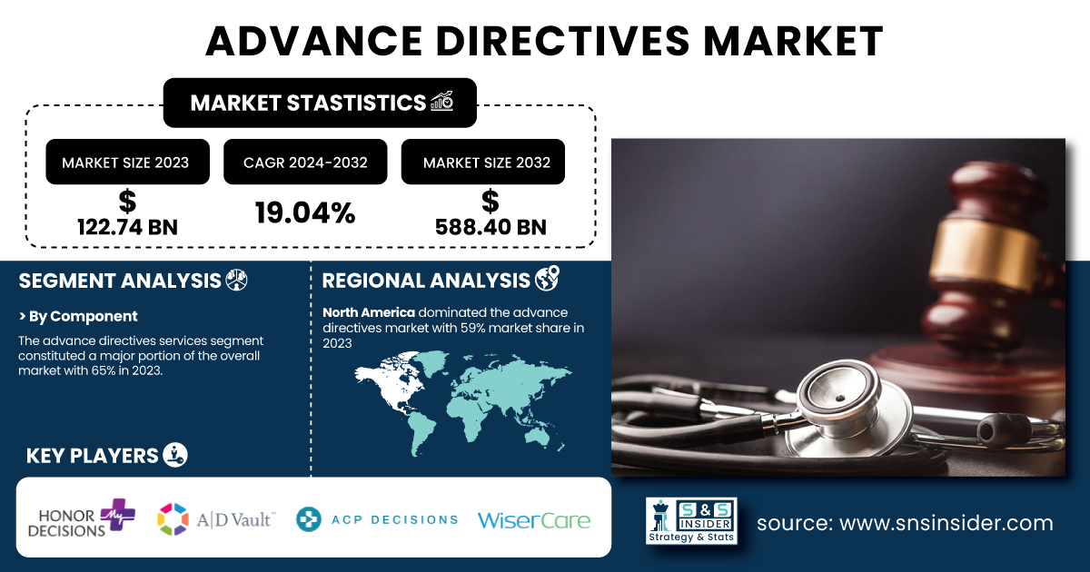 AUSTIN, TX, UNITED STATES, January 28, 2025 /EINPresswire.com/ -- According to Research by SNS Insider, The global Advance Directives Market size was valued at USD 122.74 billion in 2023 and is projected to reach USD 588.40 billion by 2032 with a compound annual growth rate (CAGR) of 19.04% during the forecast period2024 to 2032.Advance Directives Market growth is driven by the increasing adoption of end-of-life planning services, government initiatives promoting the creation of advance directives, and the rising demand from aging populations.