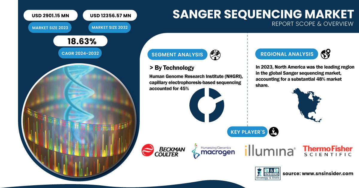 AUSTIN, TX, UNITED STATES, January 28, 2025 /EINPresswire.com/ -- According to Research by SNS Insider, the Sanger Sequencing Market size was valued at USD 2,901.15 million in 2023 and is projected to reach an impressive USD 12,356.57 million by 2032, growing at a compound annual growth rate (CAGR) of 18.63% during the forecast period 2024–2032.Government Support and Advancements Driving Growth in the Sanger Sequencing Market