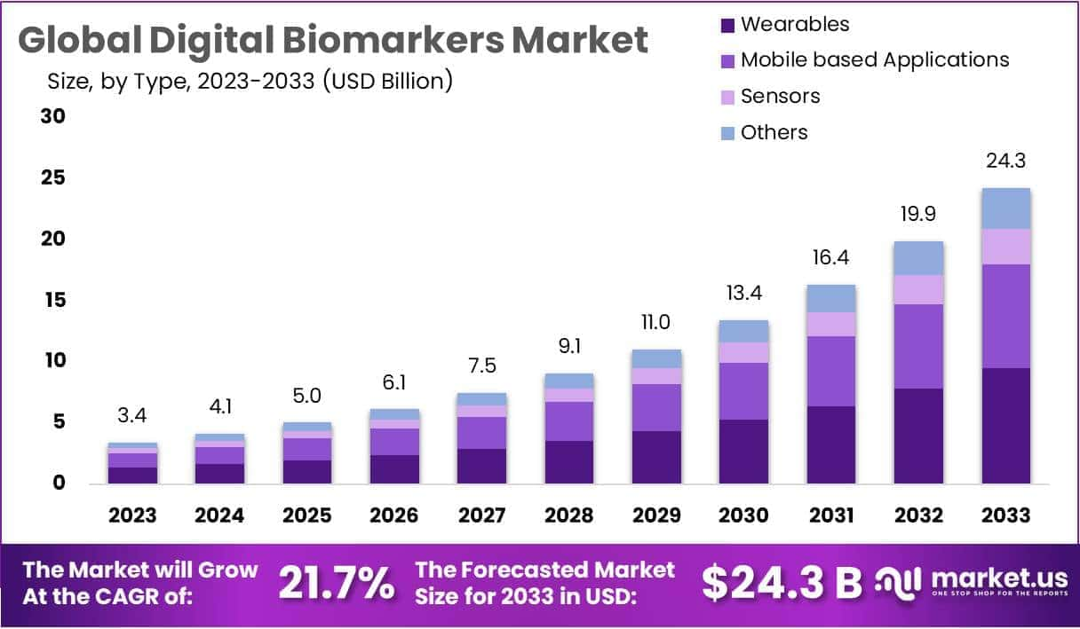 Digital Biomarkers Market Set to Reach USD 24.3 Billion by 2033|Type, Clinical Practice, Application, End-User Analysis