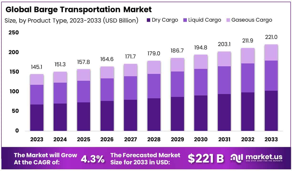 The Global Barge Transportation Market is projected to reach USD 221 billion by 2033, up from USD 145.1 billion in 2023, expanding at a CAGR of 4.30% during the forecast period from 2024 to 2033.