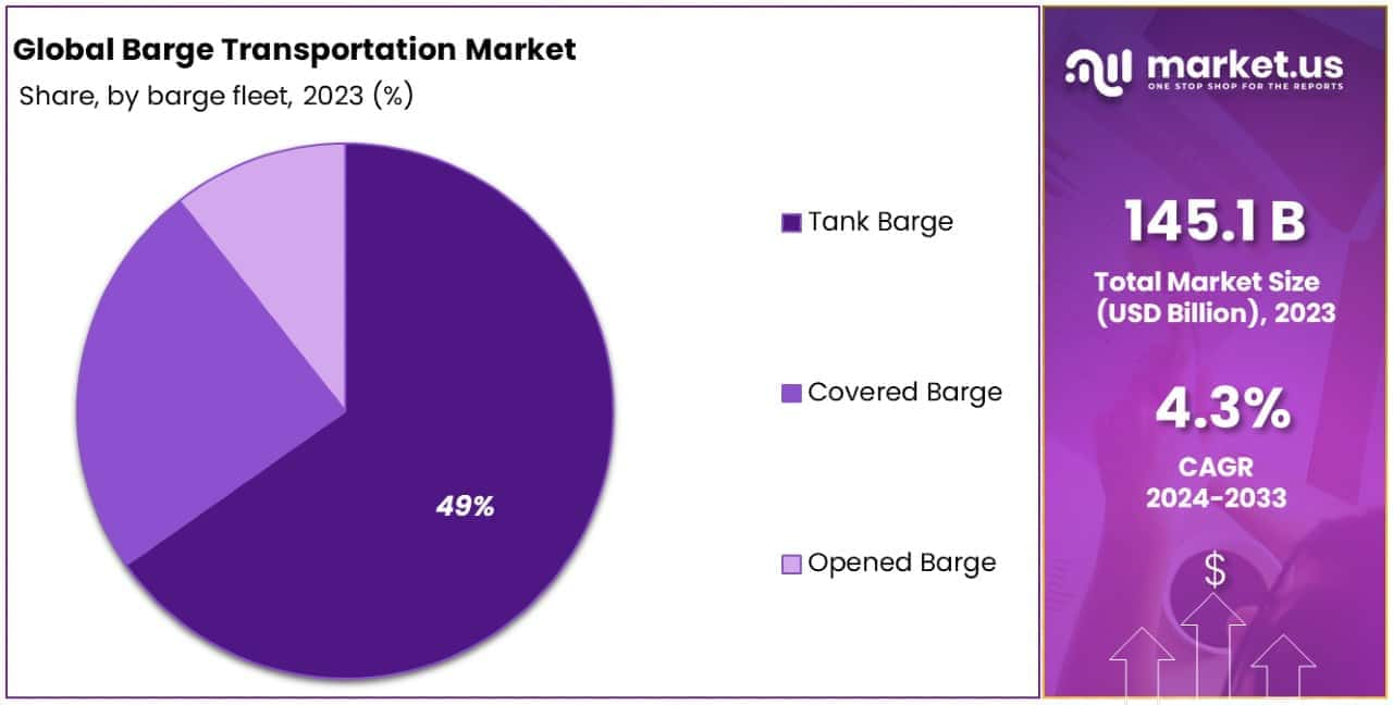 ~~ Tank Barges also play a significant role, capturing 49.2% of the market share. These barges are essential for the safe transportation of liquid cargoes, including oil and chemicals.