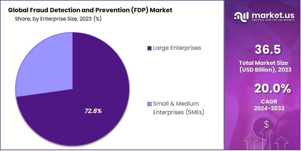 In applications, the market is led by the Payment Fraud segment, capturing more than 47.5% share owing to increased digital transactions and corresponding fraud. By enterprise size, Large Enterprises dominate with over 72.8% share, attributed to their resources for advanced FDP system integration needed to manage complex operations and comply with stringent regulations.