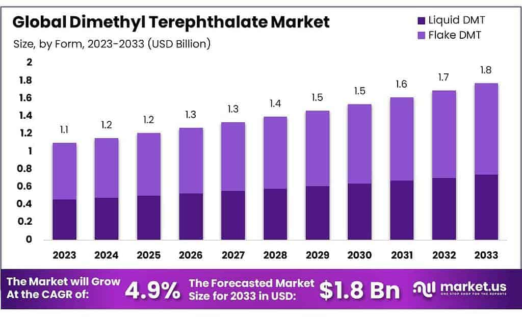 • Dimethyl Terephthalate (DMT) market size is projected to grow from USD 1.1 billion in 2023 to USD 1.8 billion by 2033, At a (CAGR) of 4.9% during this period.