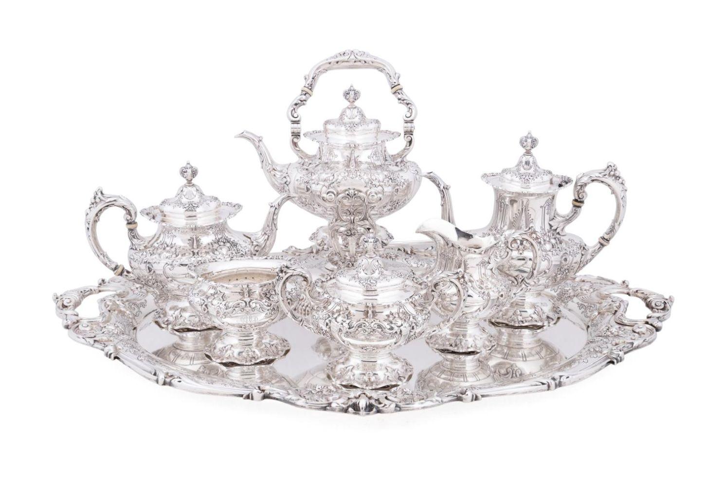 Seven-piece Reed & Barton sterling hot beverage service in the Francis I pattern (active 1907-2019), all marked appropriately and totaling 213.09 troy oz. ($16,940).