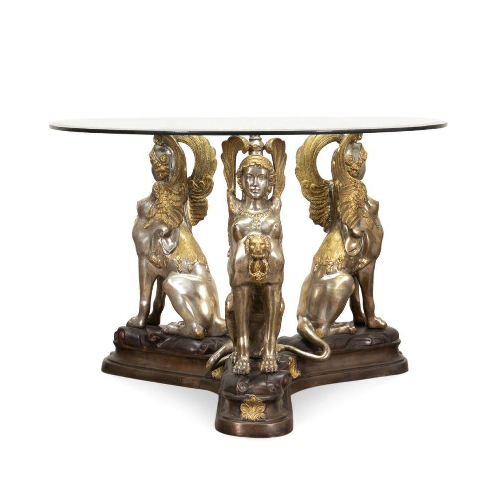 An Egyptian Revival style glass top and sphinx base center table having a silvered and gilt bronze base supporting a round glass top, apparently unmarked, 28 ¾ inches tall and 42 inches in diameter, changed hands for $10,890 against a pre-sale estimate of $1,200-$2,400.