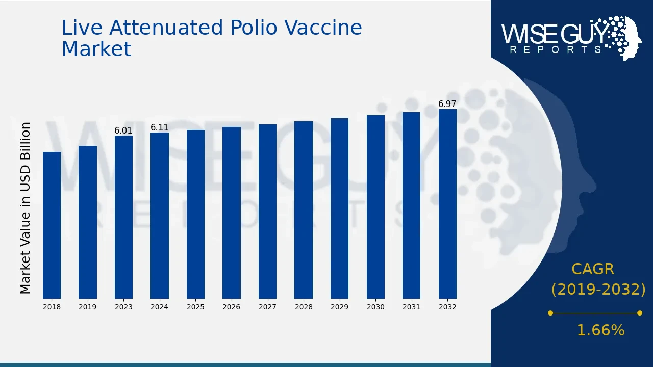 Live Attenuated Polio Vaccine Market growth was valued at 6.01 Billion USD in 2023. Live Attenuated Polio Vaccine Market Industry is expected to grow from 6.11 Billion USD in 2024 to 6.97 Billion USD by 2032. Live Attenuated Polio Vaccine Market share is projected at a CAGR 1.66% during forecast period 2025 - 2032. Enhanced formulations to reduce adverse effects and continued vaccine drives in developing regions.