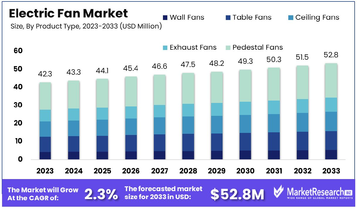 Market Growth: The Global Electric Fan Market was valued at USD 42.3 million in 2023. It is expected to reach USD 52.8 million by 2033, with a CAGR of 2.3% during the forecast period from 2024 to 2033.