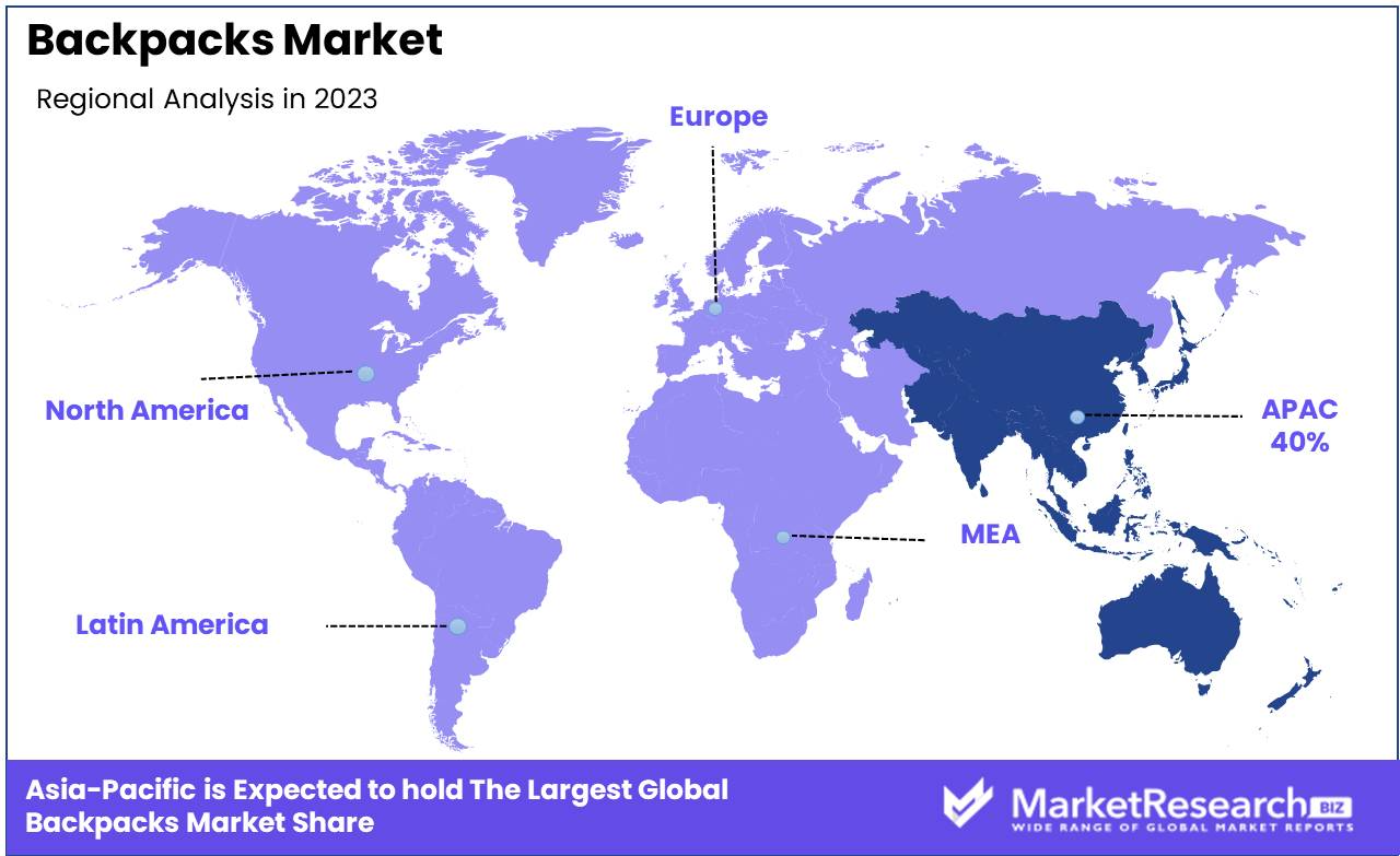 In 2023, Asia-Pacific led the global backpacks market, holding a 40% market share, driven by a large and growing population, rapid urbanization, and rising disposable incomes.