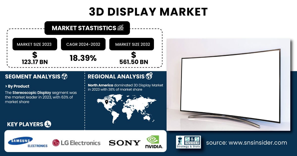 AUSTIN, TX, UNITED STATES, January 30, 2025 /EINPresswire.com/ -- Market Size & Industry InsightsAs Per the SNS Insider,“The 3D Display Market was valued at USD 123.17 Billion in 2023 and is expected to reach USD 561.50 Billion by 2032, growing at a CAGR of 18.39% over the forecast period of 2024-2032.”
