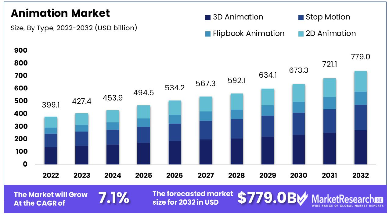The global animation market was value expected to reach USD 779.0 Billion by 2032, with a CAGR of 7.1% during the forecast period from 2023 to 2032...